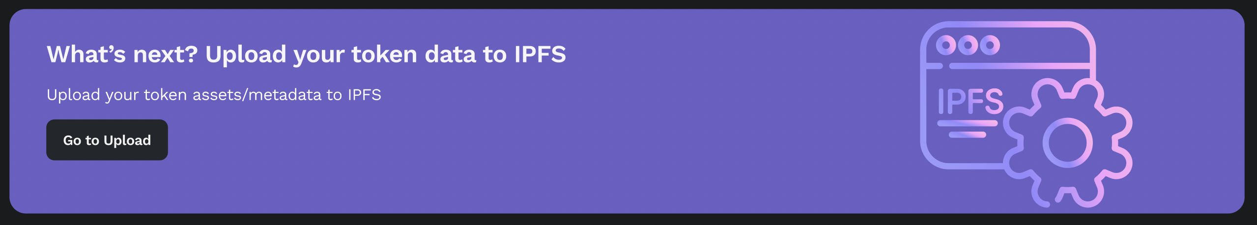 We will show you how to deploy your contract in a later section. but next step is to upload your token asset to IPFS! You can click "**Go to upload**" to start the process.