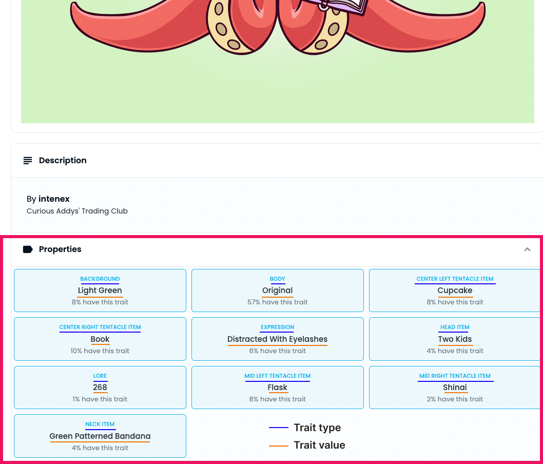 * **Attributes**: Attributes will be displayed on exchanges such as OpenSea (where they are known as Properties).&#x20;