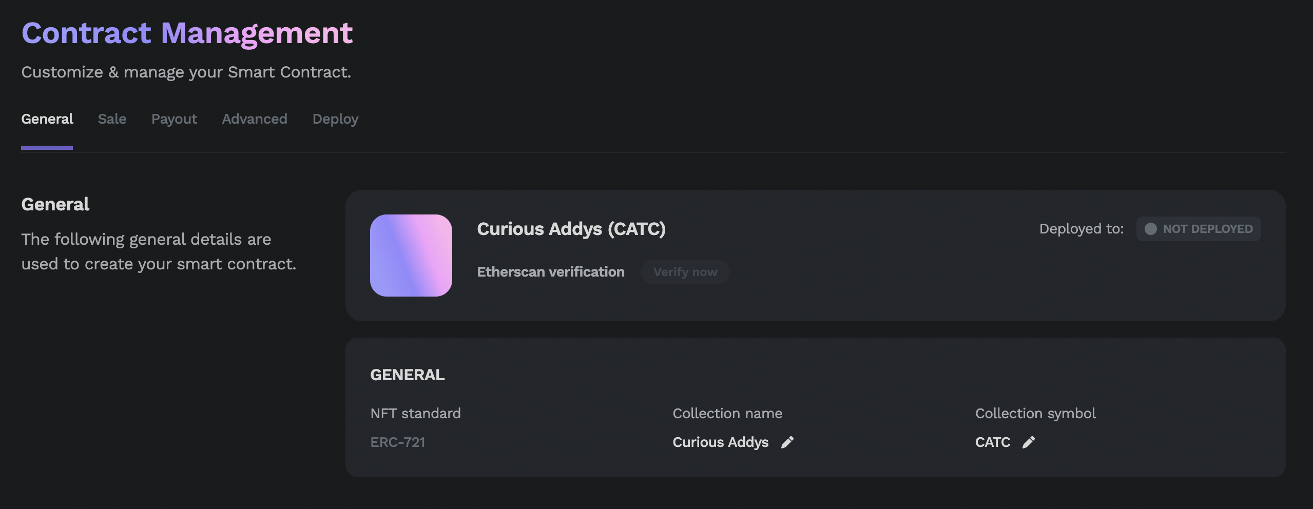 The first step for setting up your NFT collection is to configure your smart contract.&#x20;