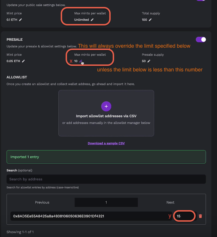 * **Overrides:** It's important to know that if your max mints per wallet are set to "unlimited" in the public sale, "x" in the presale, and "y" for a specific wallet address, the presale max mint of "x" will always override the quantity you set for the specified address, even if "y" is greater than "x." But if you set a limit on the specified address that is less than "x," that specific address can only mint up to the limit "y" you set. For an example, please look at the picture below.