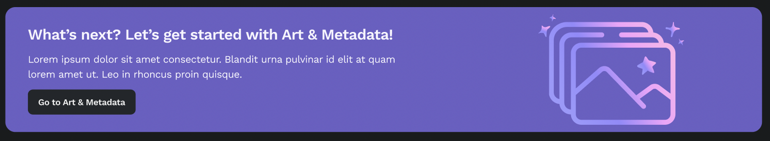 We will show you how to deploy your contract in a later section. First, let's dive into Art & Metadata to set up art for your collection! You should see the following banner in your management console - click "**Go to Art & Metadata**" to start the process.