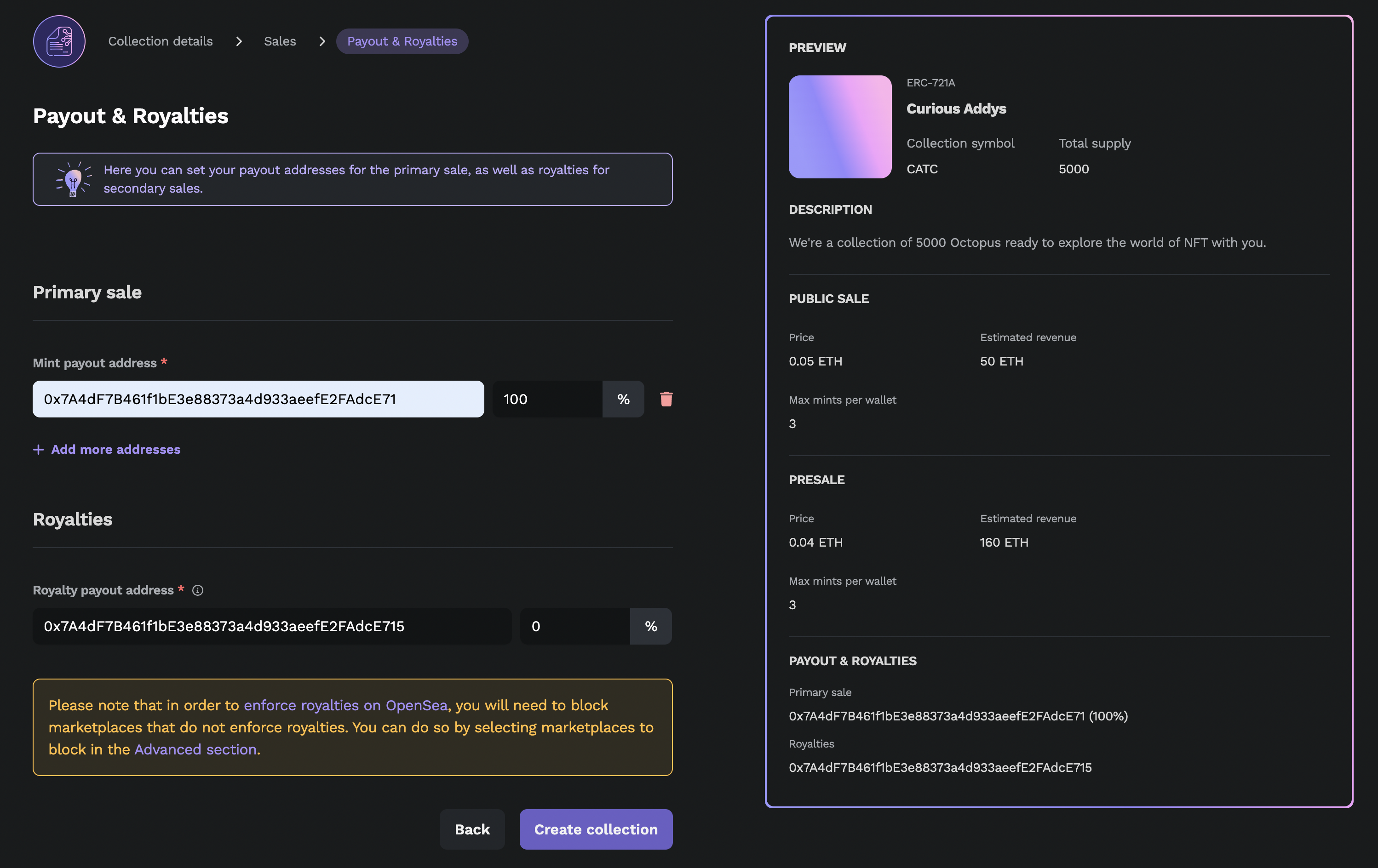 Lastly, fill in payout & royalties information (make sure to set the correct addresses as all your revenue goes to these addresses!)
