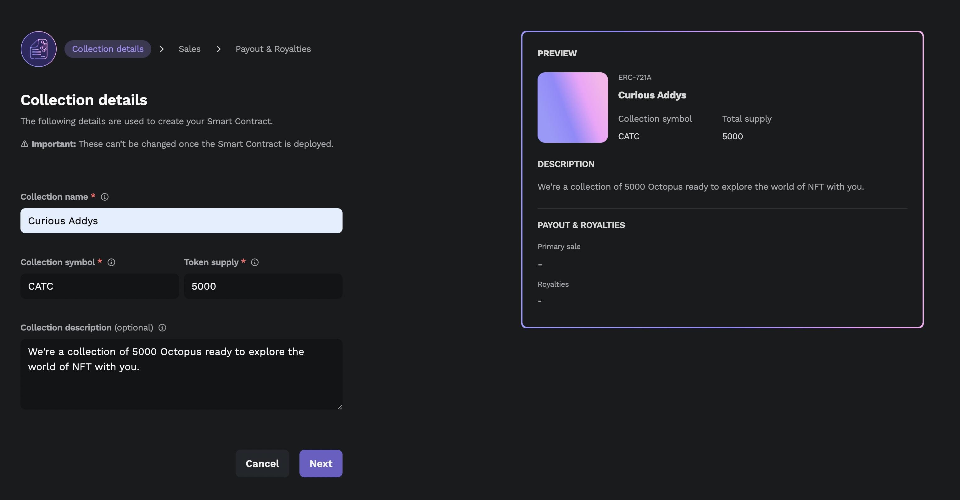 Please note that collection name, collection symbol, and token supply cannot be changed after you deploy your smart contract. Please make sure all the information is correct before you deploy your contract.