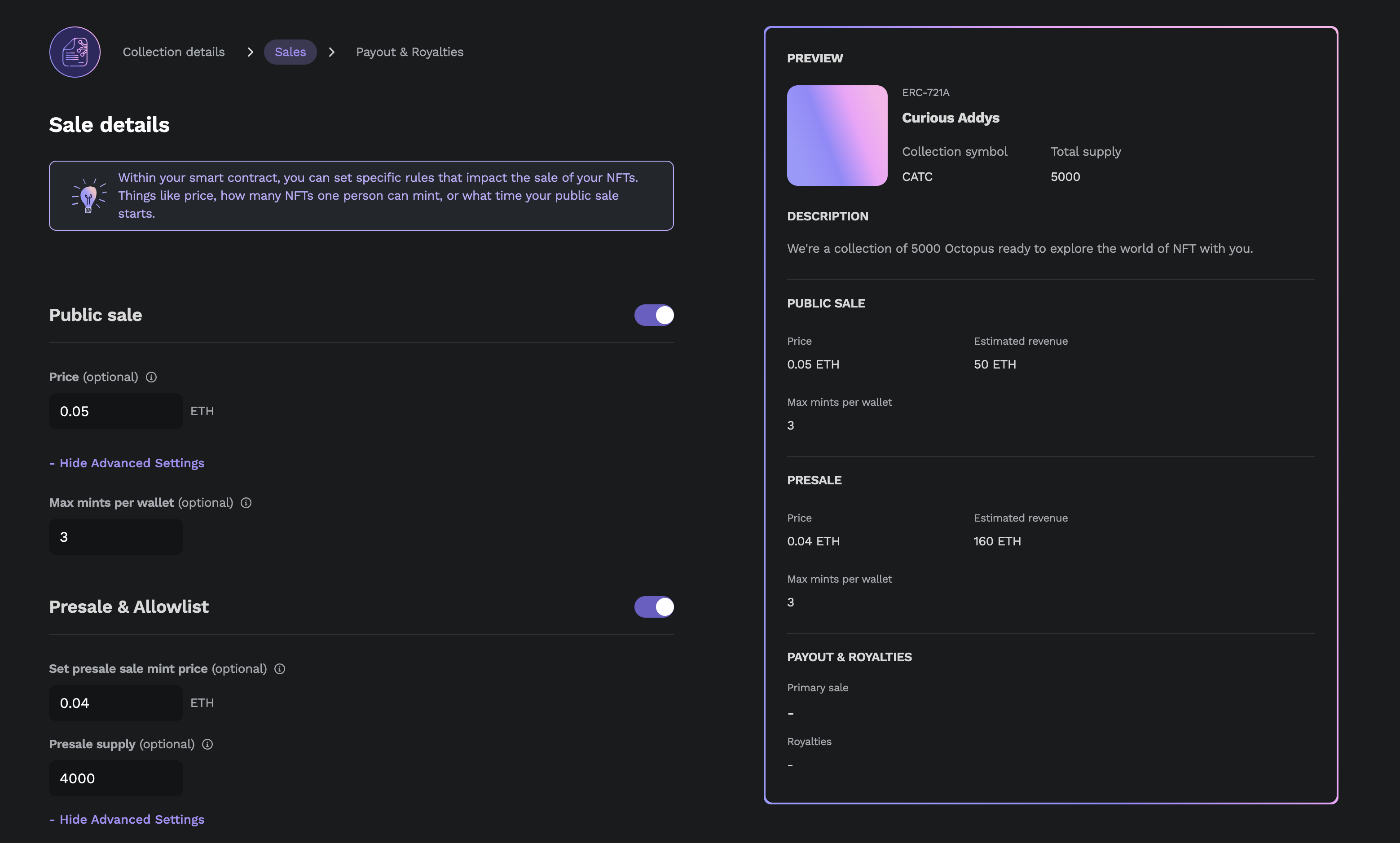 * **Presale supply:** If you would like to limit presale mints, please enter the number of total NFTs available for minting during presale. Once mints reach this limit, the presale will automatically turn off and all remaining NFTs can only be minted in the public sale. **This number cannot be changed after deployment.**&#x20;