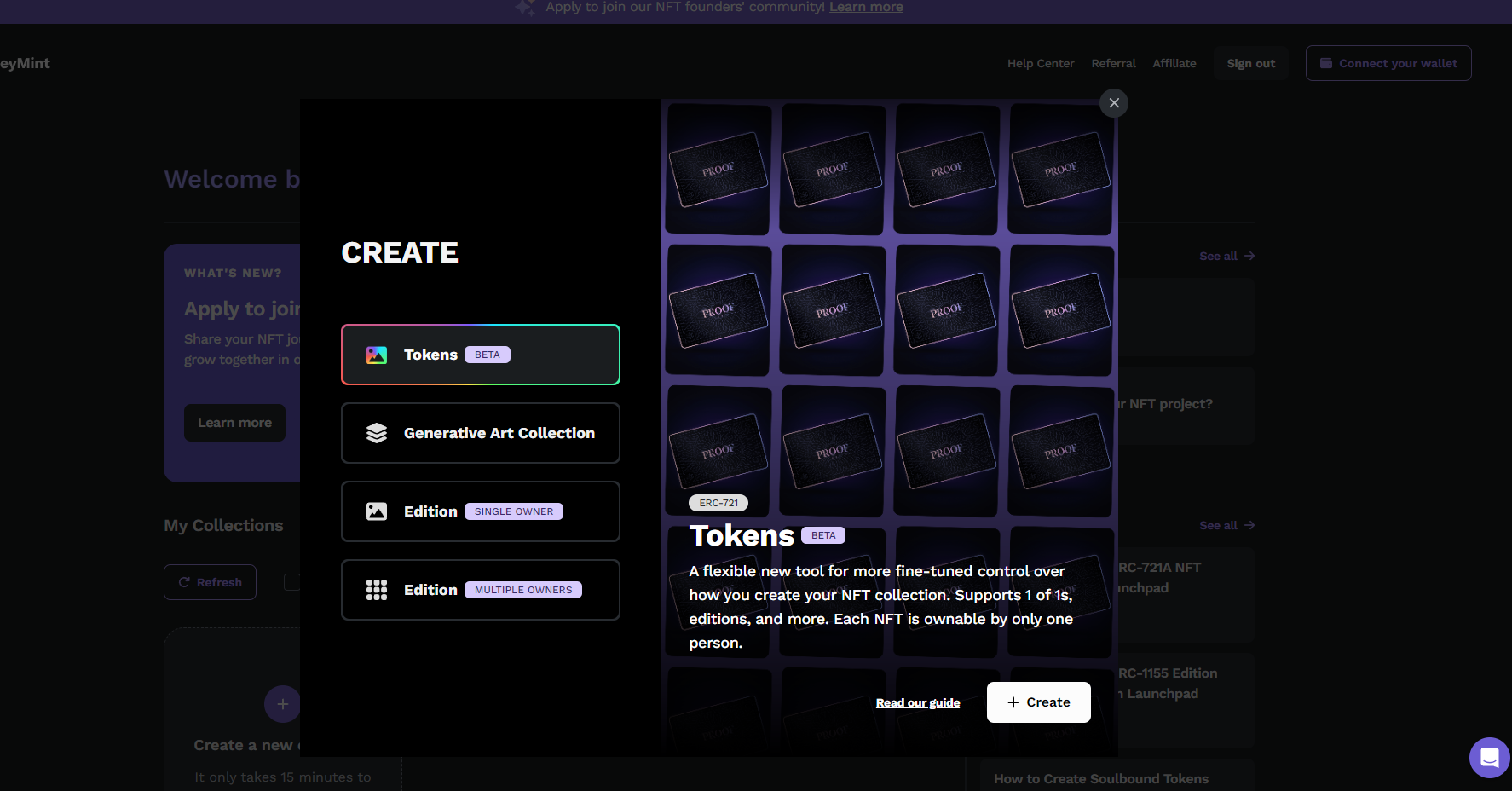 Begin by deciding the type of NFT collection you want to establish. There are four distinct flows to choose from. Each flow represents a different approach or standard in the NFT space. To understand more about these options and determine which one aligns best with your collection's goals, proceed to the next page where each flow is explained in detail.